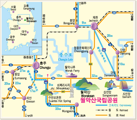 월악산은 속리산과 소백산을 잇는 백두대간의 한가운데 자리 잡고 있어 산세가 험준하면서도 기암괴석이 많습니다. 그래서 단풍이 물들면 바위와 숲이 어우러진 독특한 풍광을 볼 수 있는 것이 큰 매력입니다.