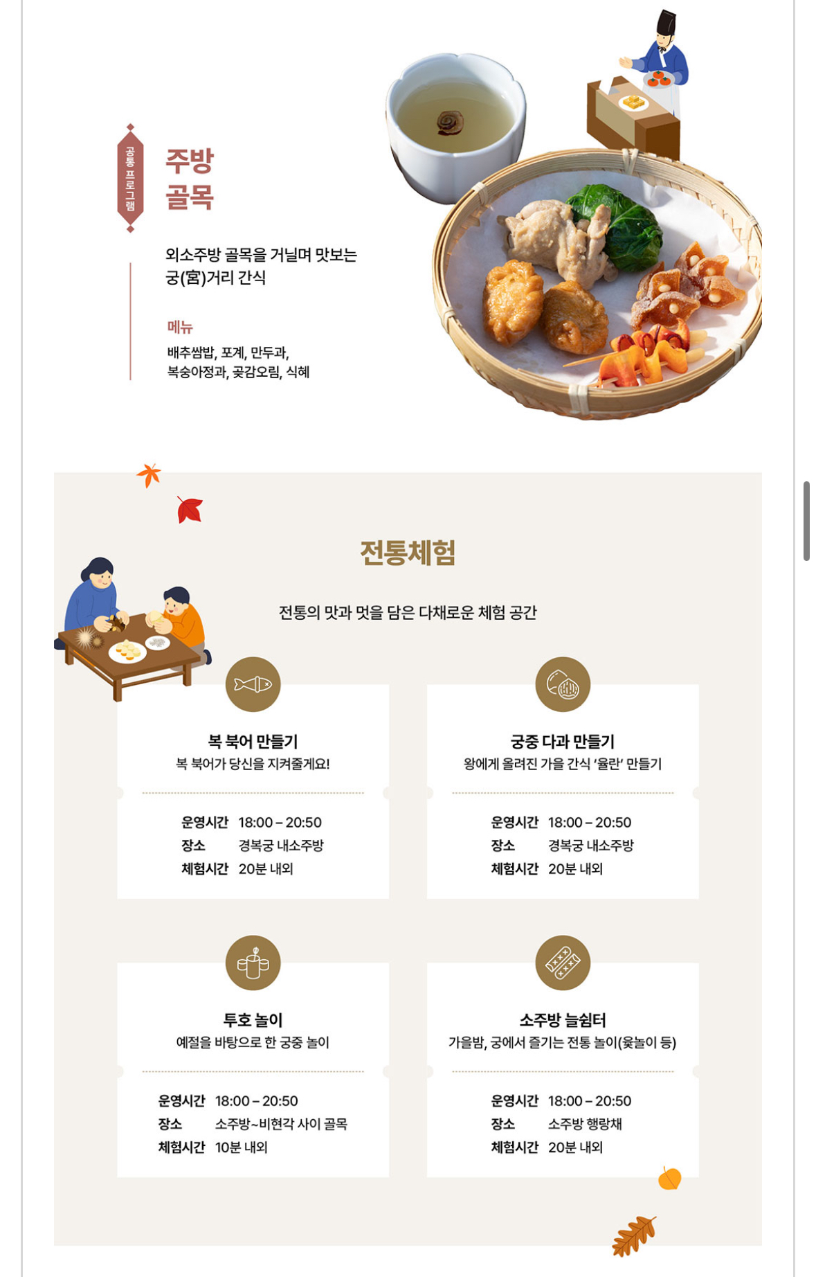 - 다담(茶談)-시식공감 : 경복궁 생물방에서 왕실 후식과 궁중다과를 맛보는 프로그램. 전통 차와 어울리는 고급 다과를 체험할 수 있어, 조용한 가을밤에 어울립니다.