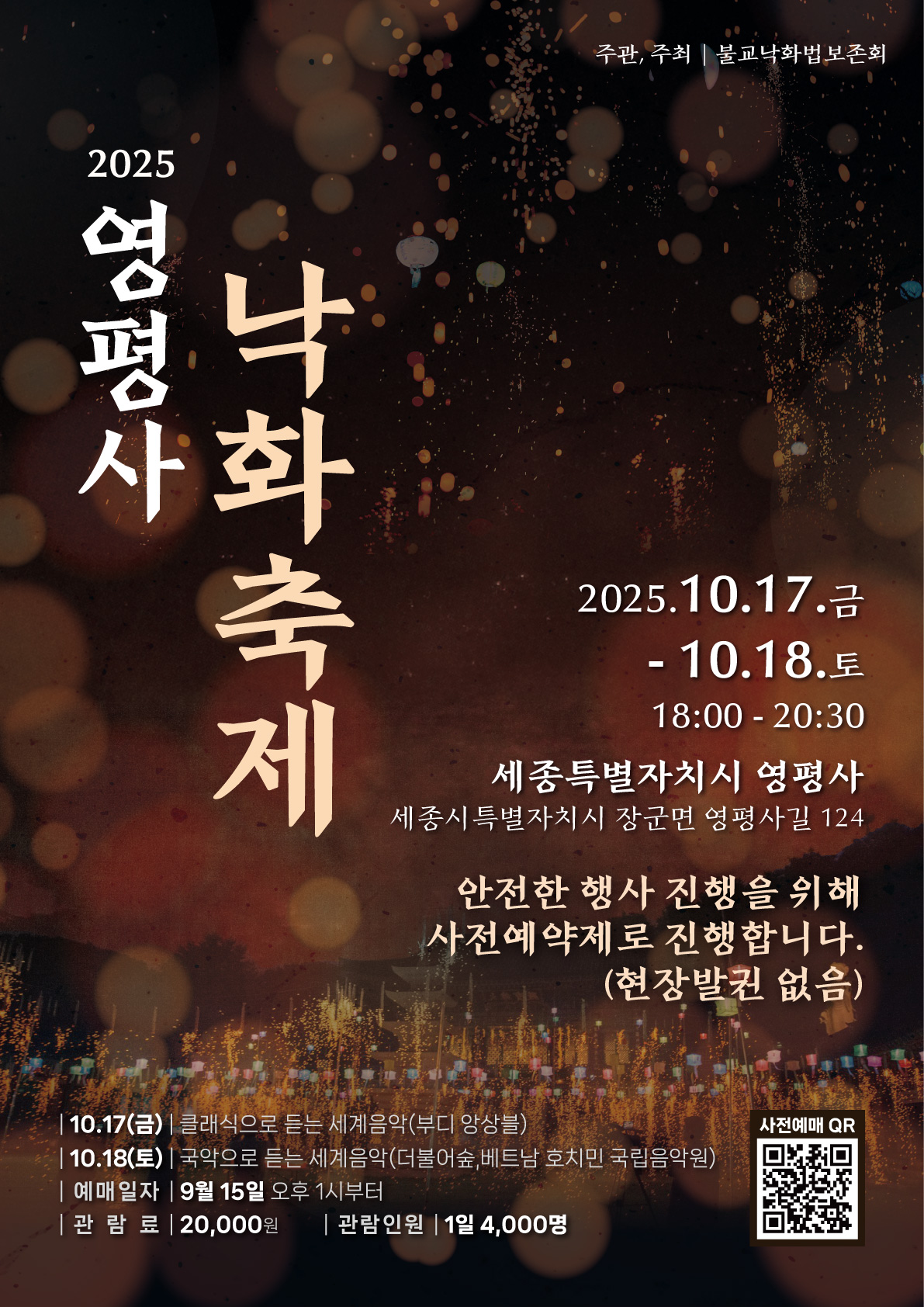 세종 영평사 낙화축제는 전통과 음악, 그리고 가을밤의 낭만이 어우러진 특별한 축제입니다. 올해는 사전예약과 입장료가 도입되어 조금 달라졌지만, 그만큼 더 체계적이고 쾌적한 관람이 기대됩니다.